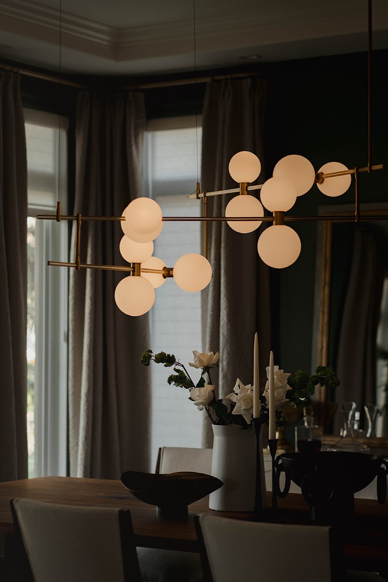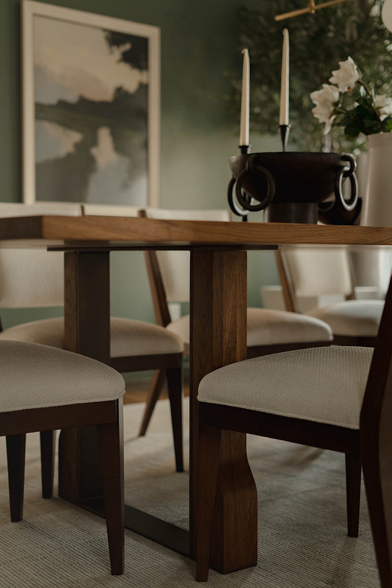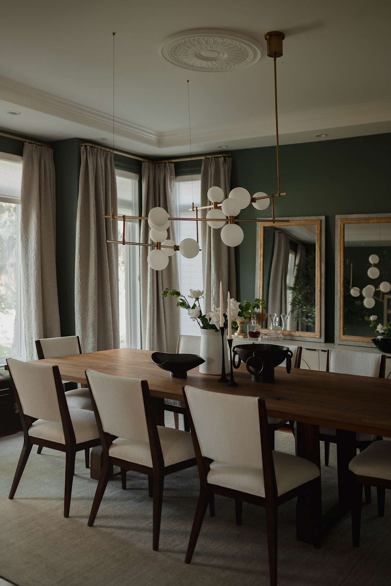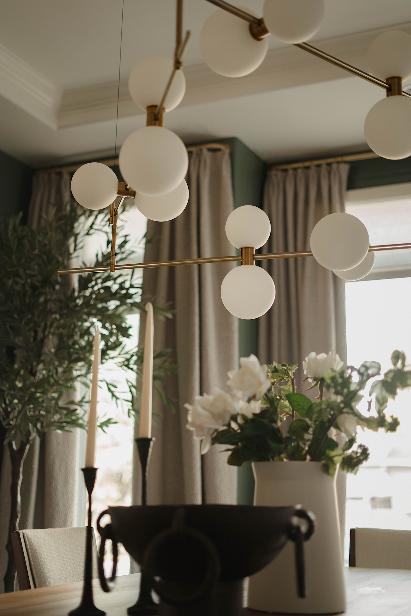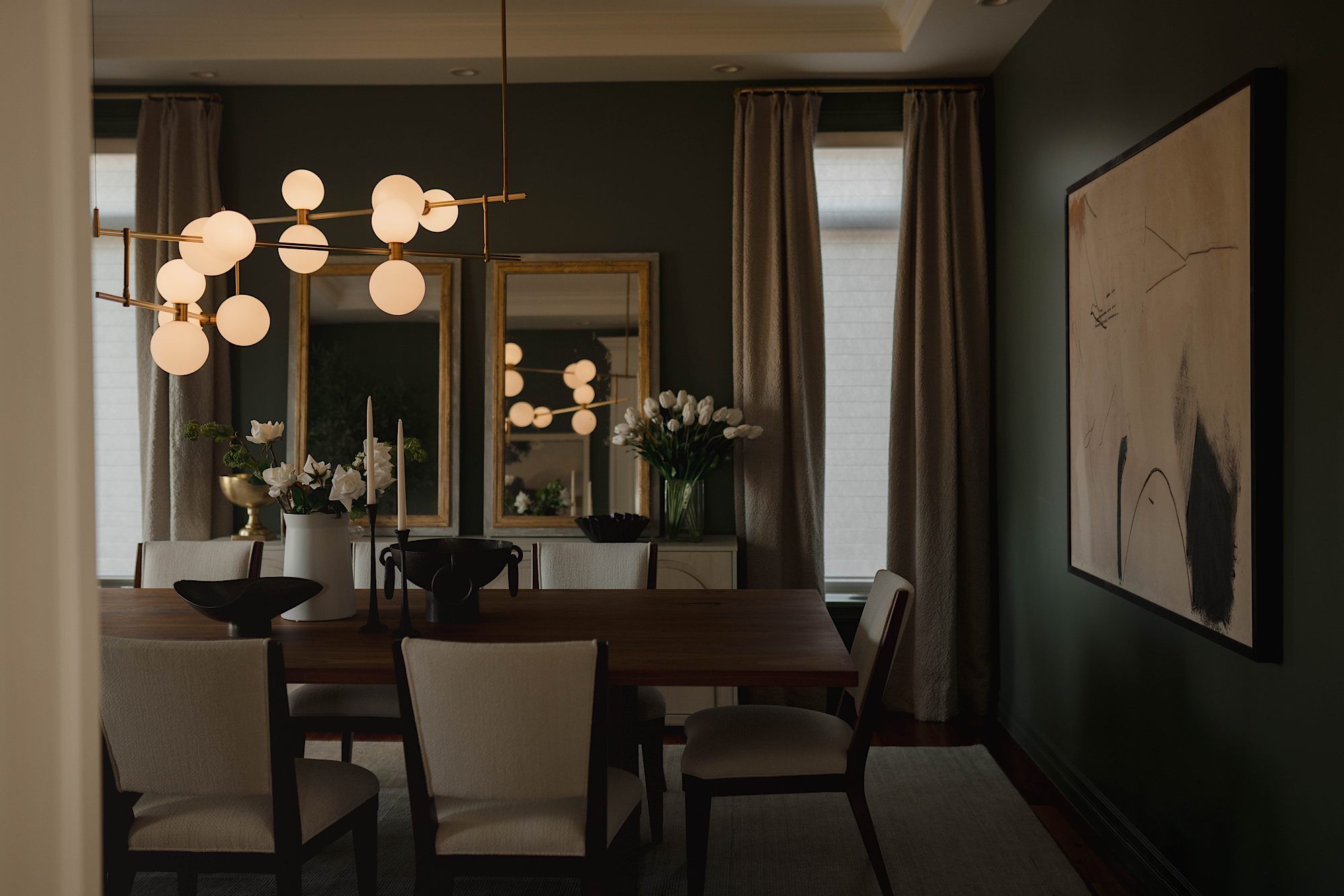 In order to cater to the homeowners' specific and differing aesthetics, a combination of colour and creamy neutrals was used throughout the house. Creating a fresh canvas for the design, we used a richly pigment palette of paint; Green Smoke in the dining room and Shaded and Wimborne Whites in the great room.