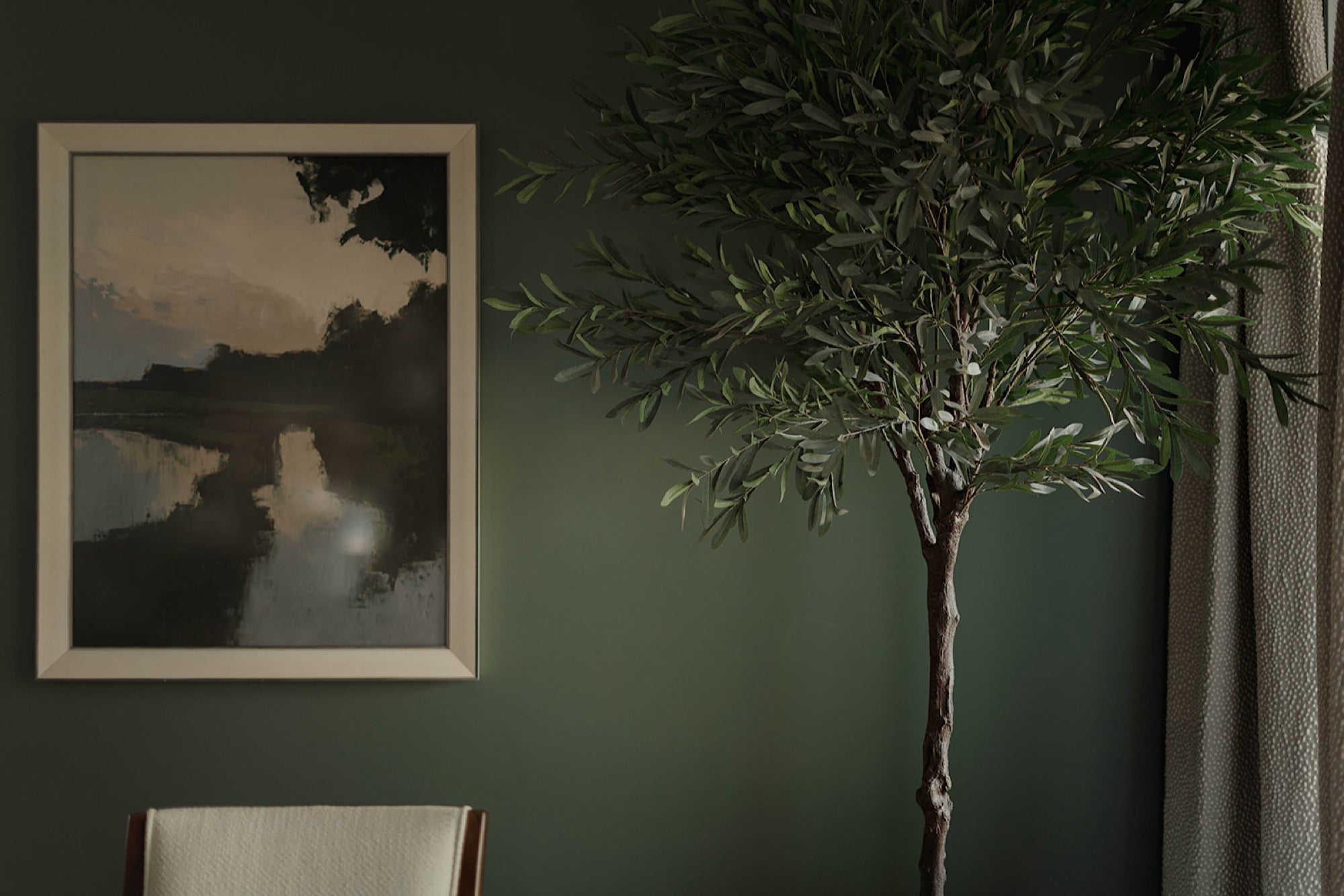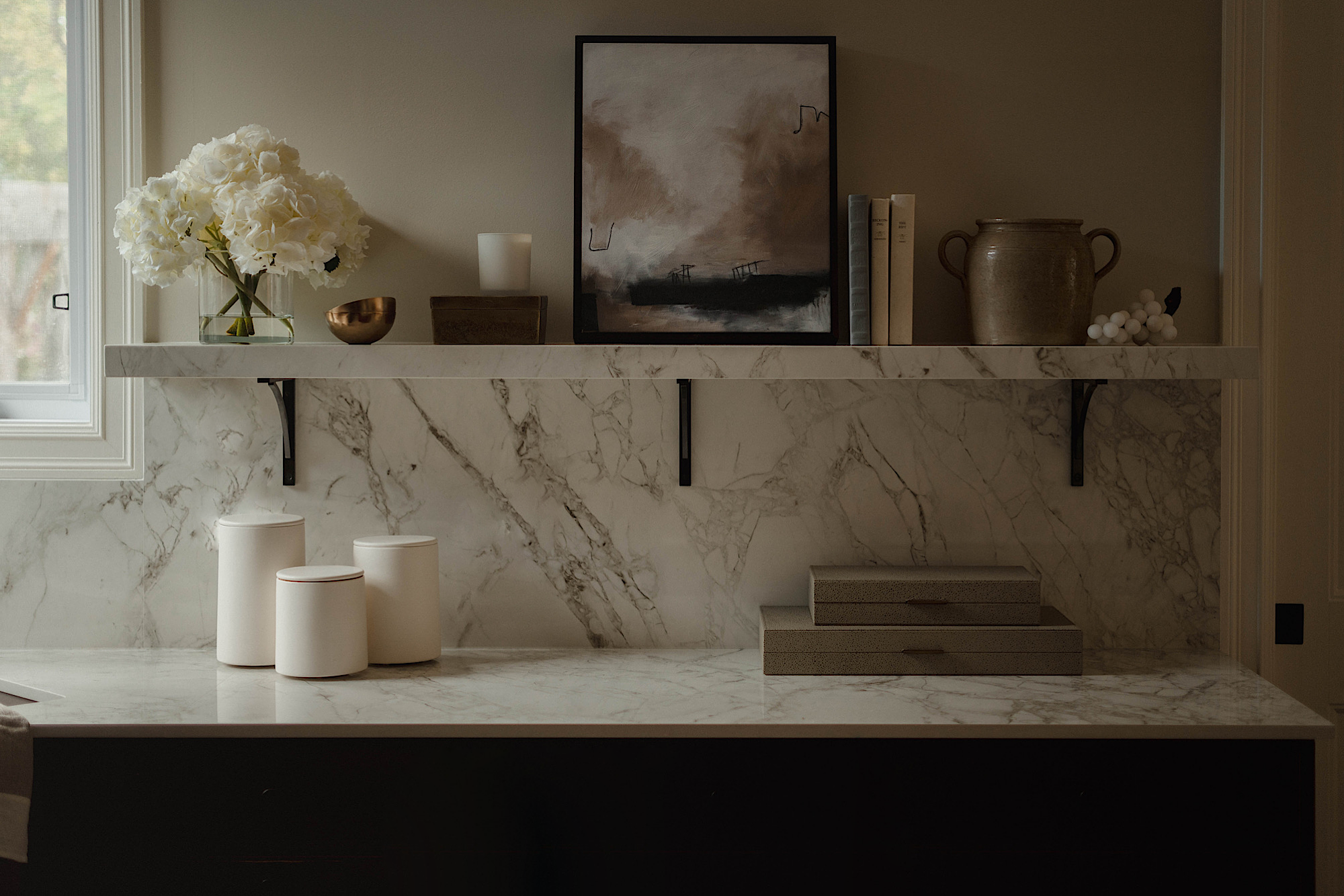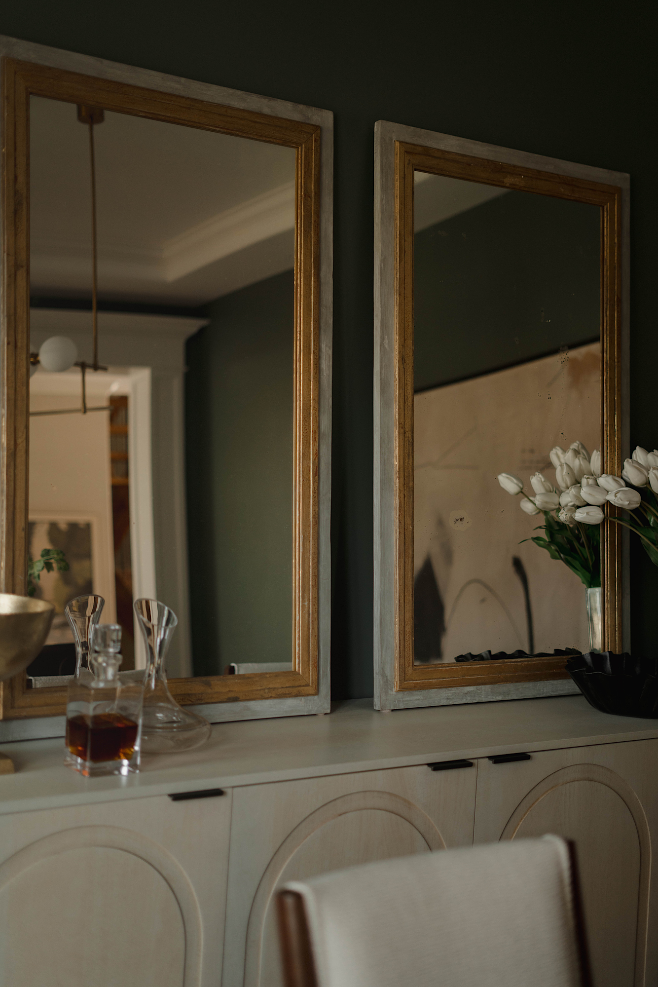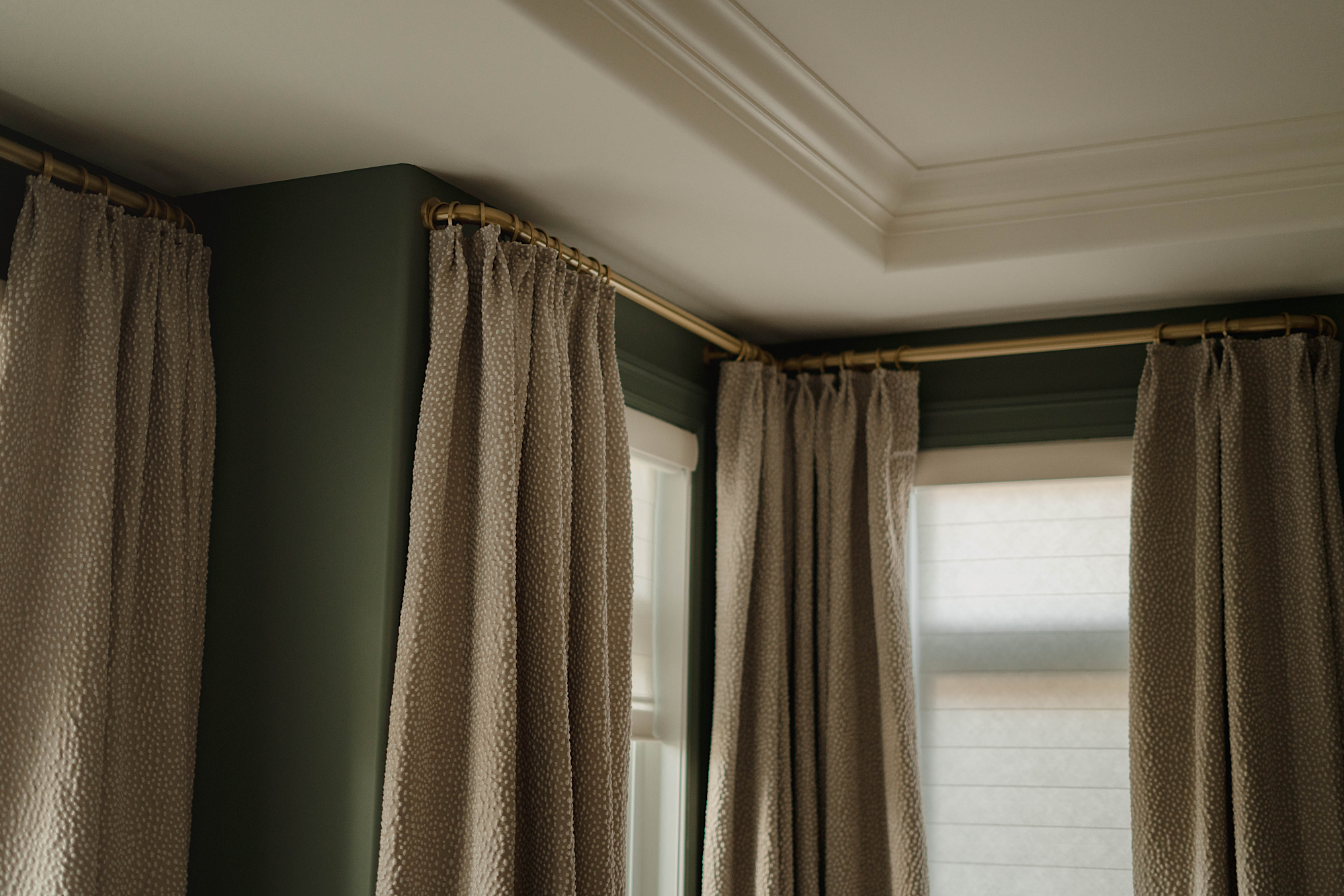 In order to cater to the homeowners' specific and differing aesthetics, a combination of colour and creamy neutrals was used throughout the house. Creating a fresh canvas for the design, we used a richly pigment palette of paint; Green Smoke in the dining room and Shaded and Wimborne Whites in the great room.