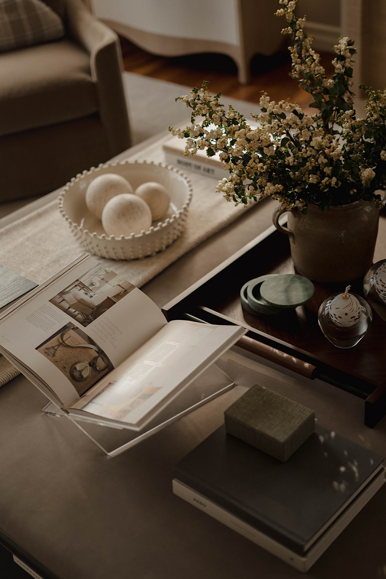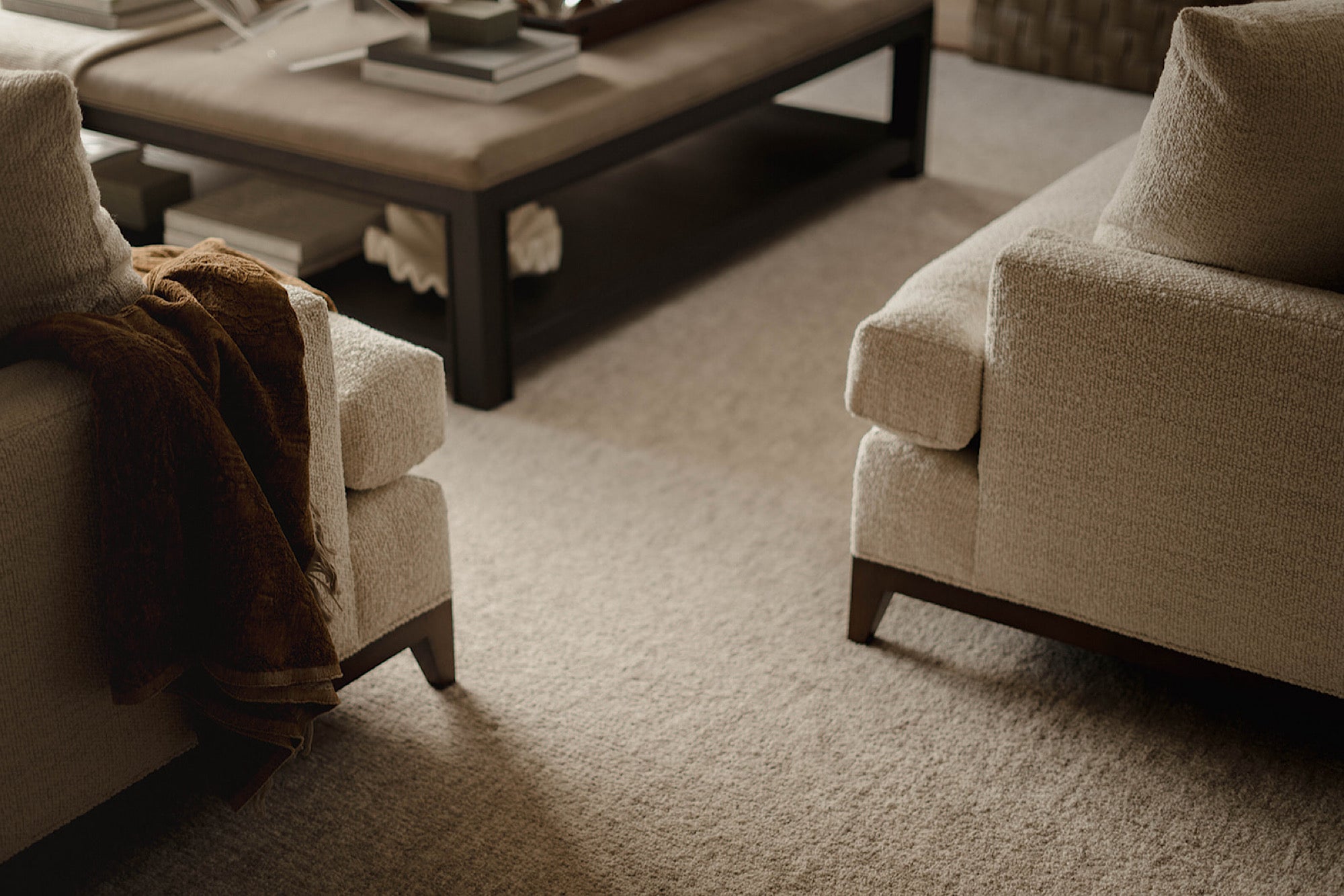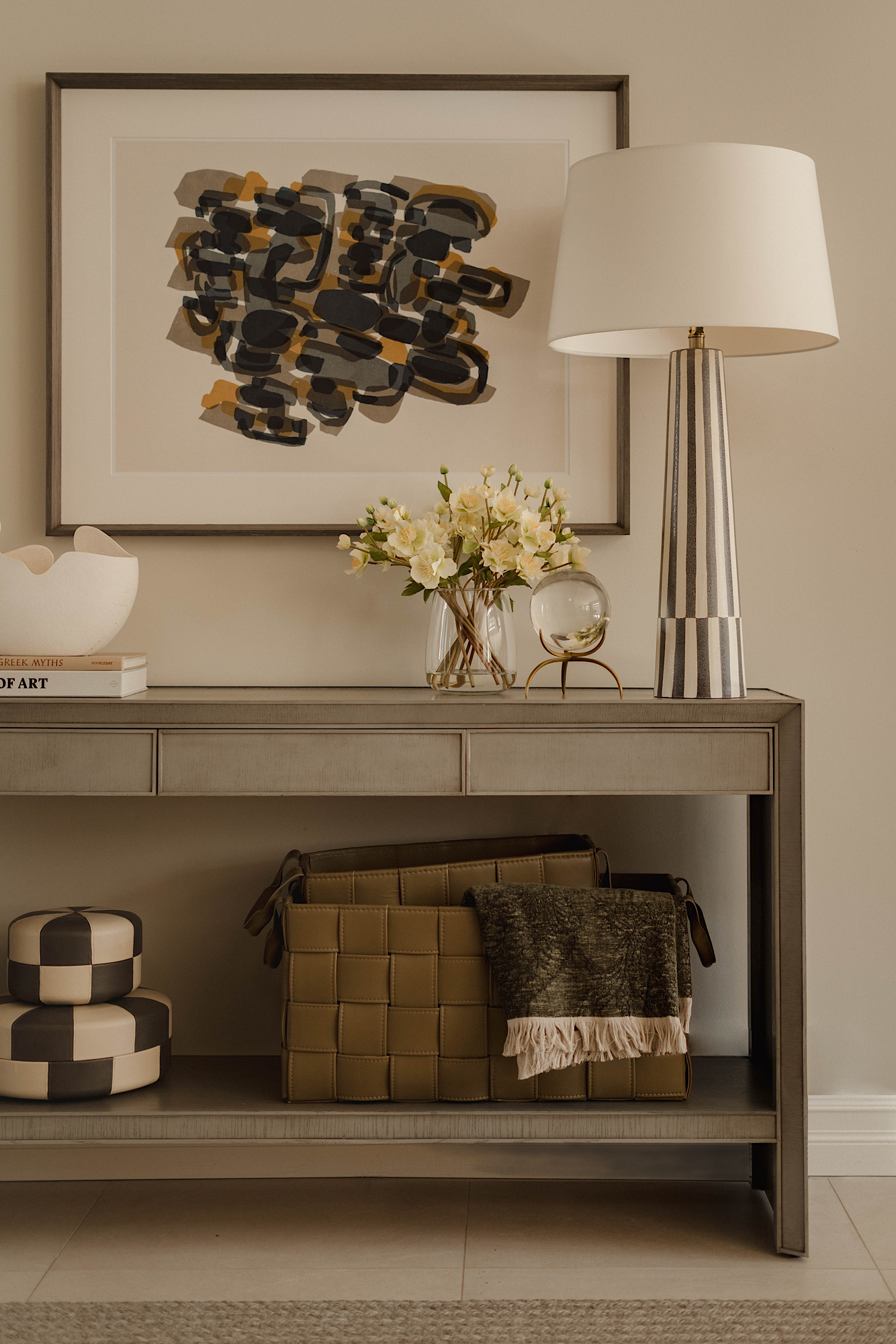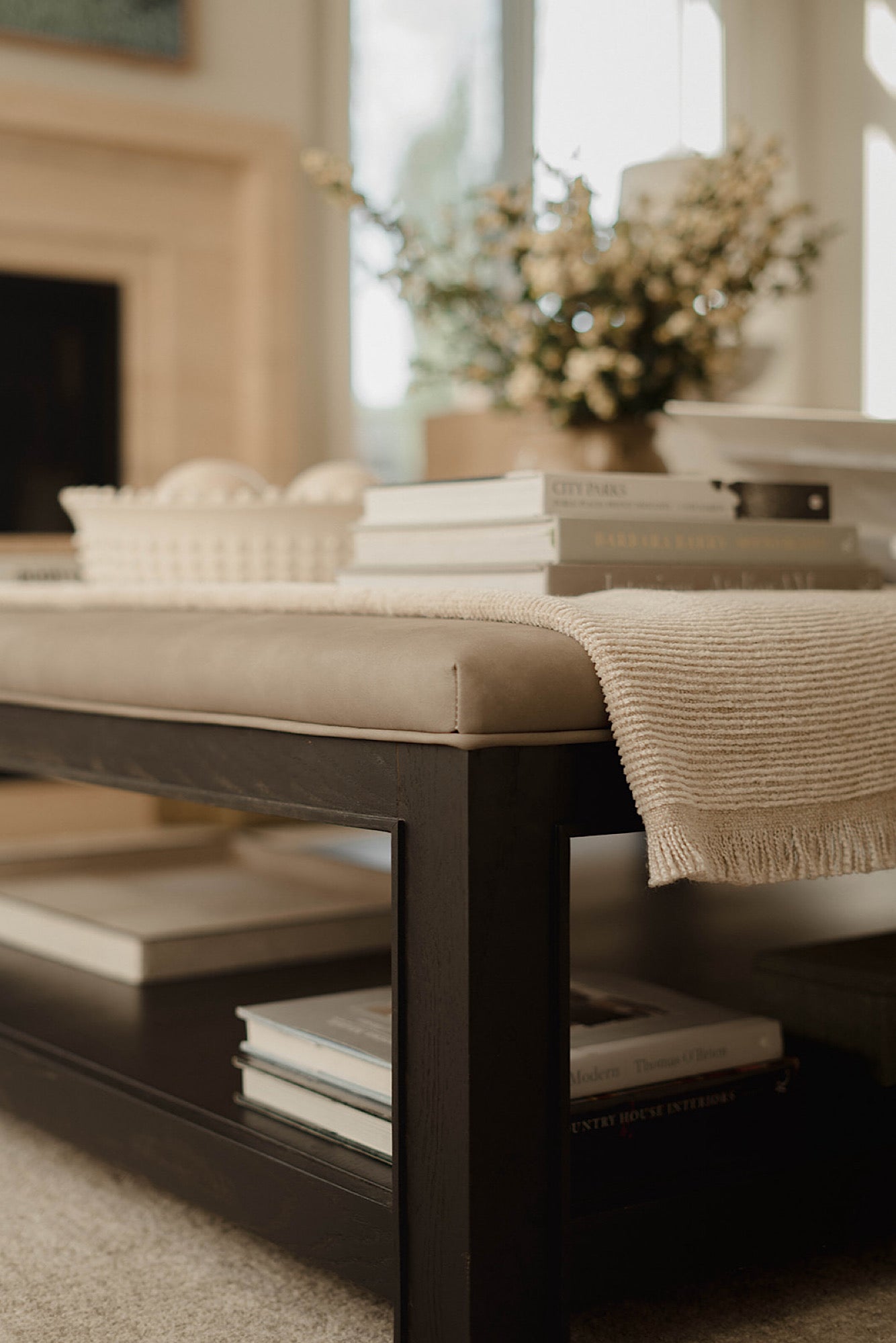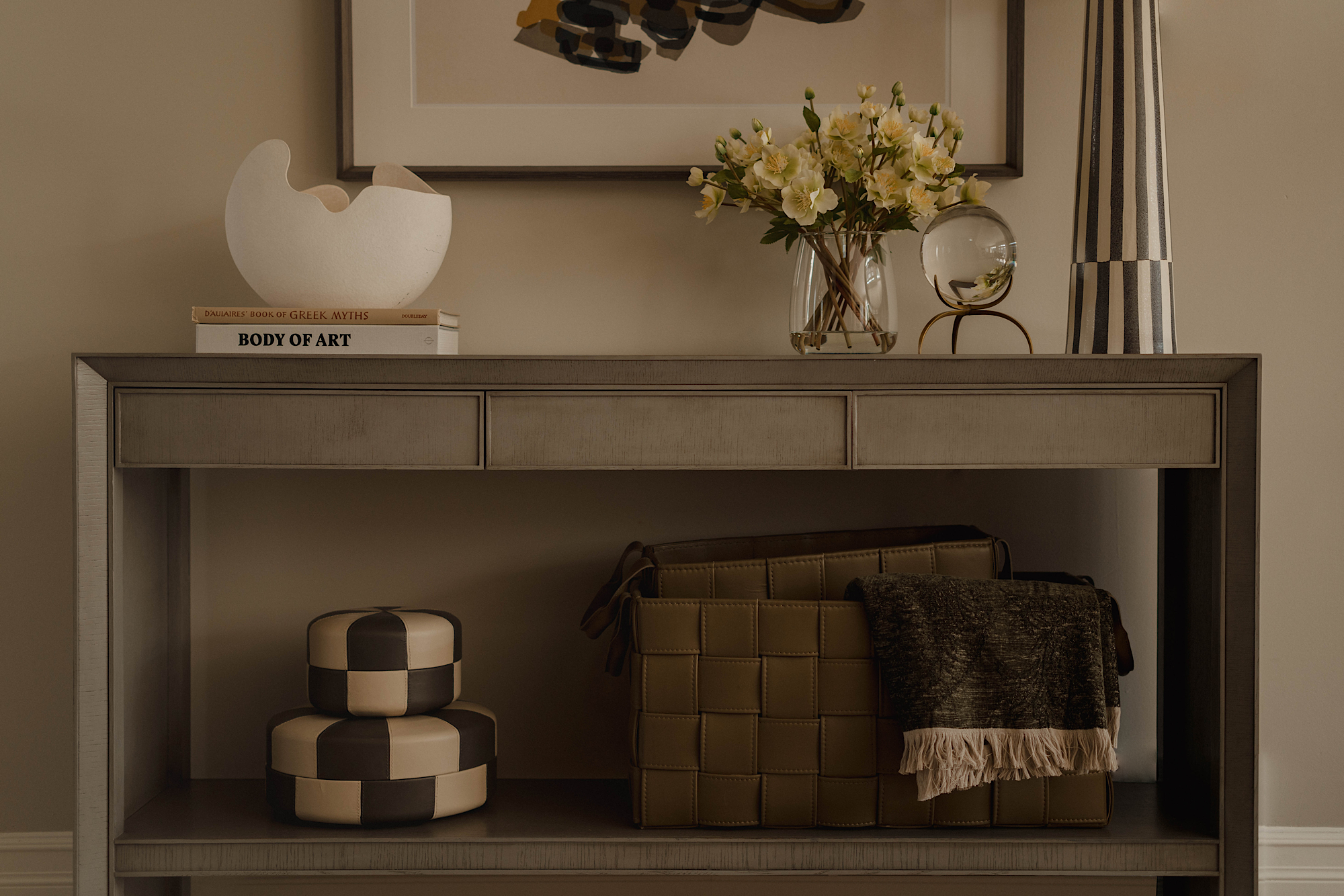 In order to cater to the homeowners' specific and differing aesthetics, a combination of colour and creamy neutrals was used throughout the house. Creating a fresh canvas for the design, we used a richly pigment palette of paint; Green Smoke in the dining room and Shaded and Wimborne Whites in the great room.
