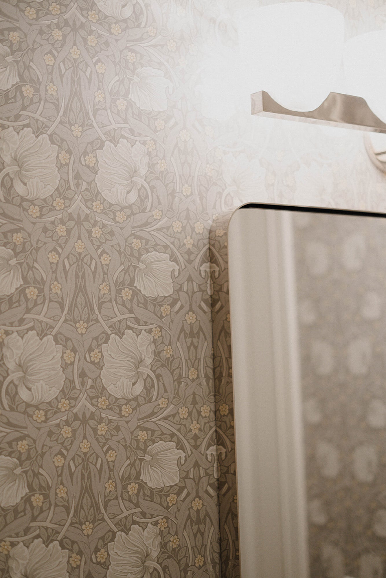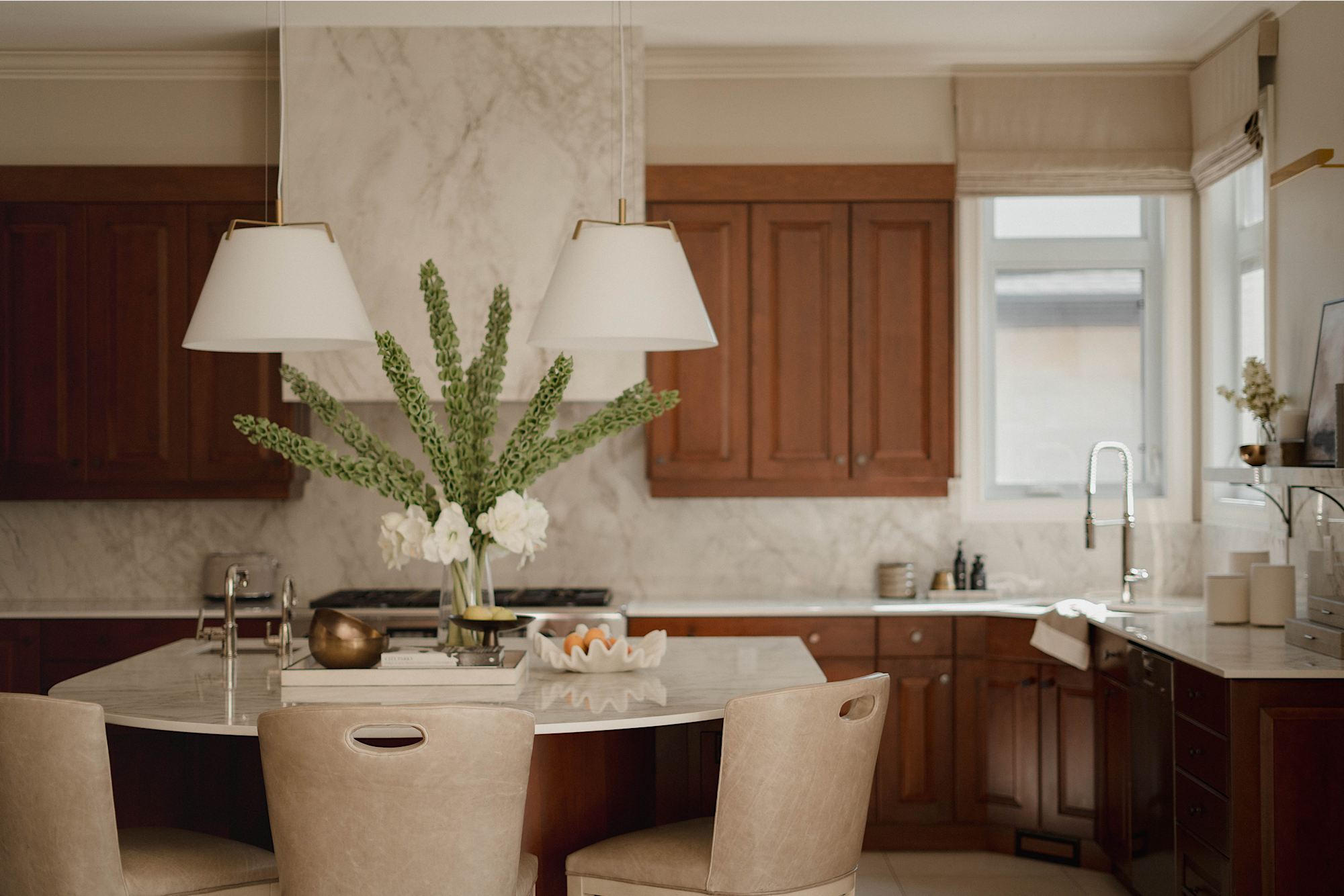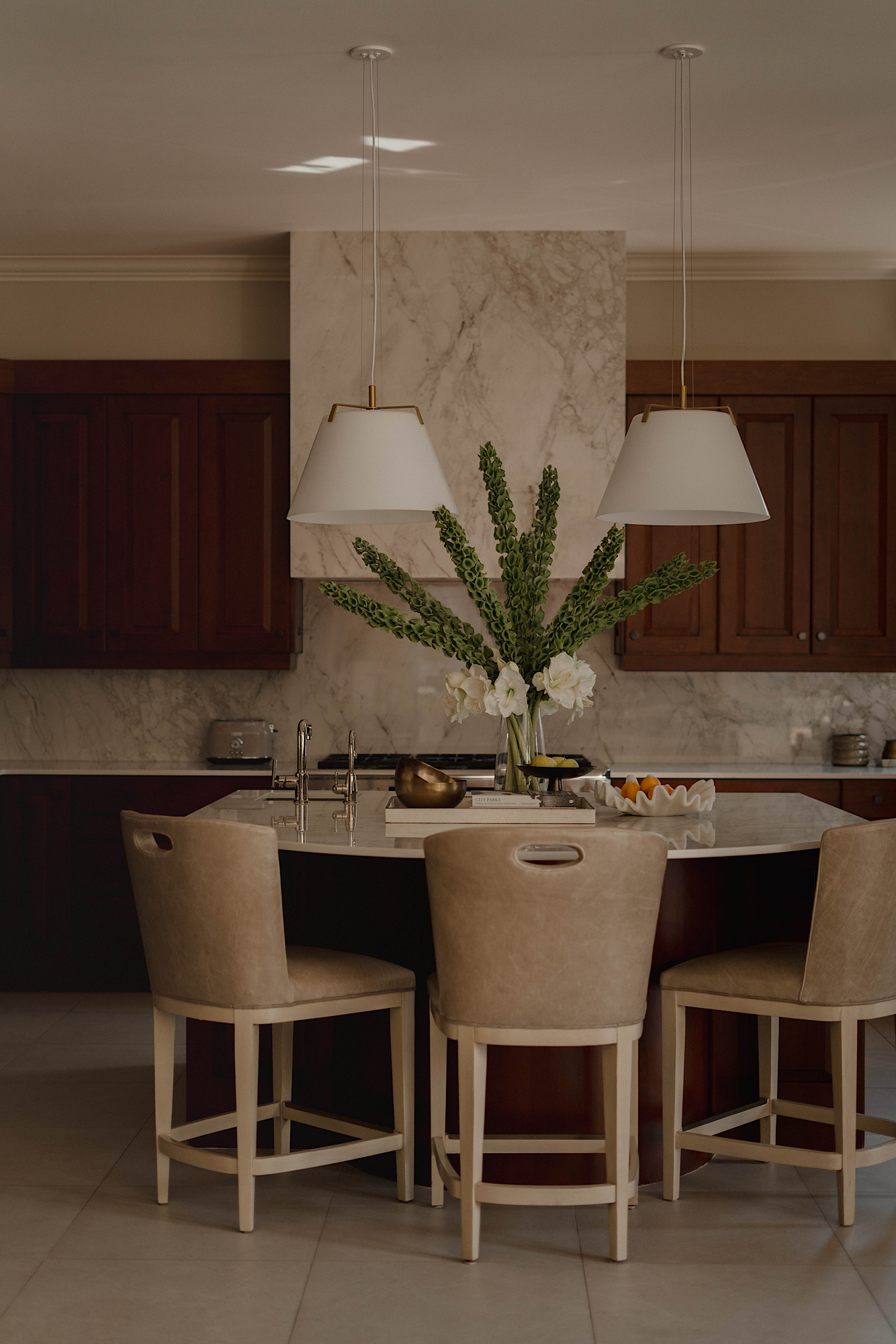 The kitchen underwent a major update, complete with newly tiled floors, an upgraded counter and backsplash with the highly durable and visually striking material of Dekton. A pair of crisp, wire-suspended pendants nudge the kitchen towards a modern aesthetic, while classic features like a Morris & Co wallpaper in the powder room balance the combination of styles.Â