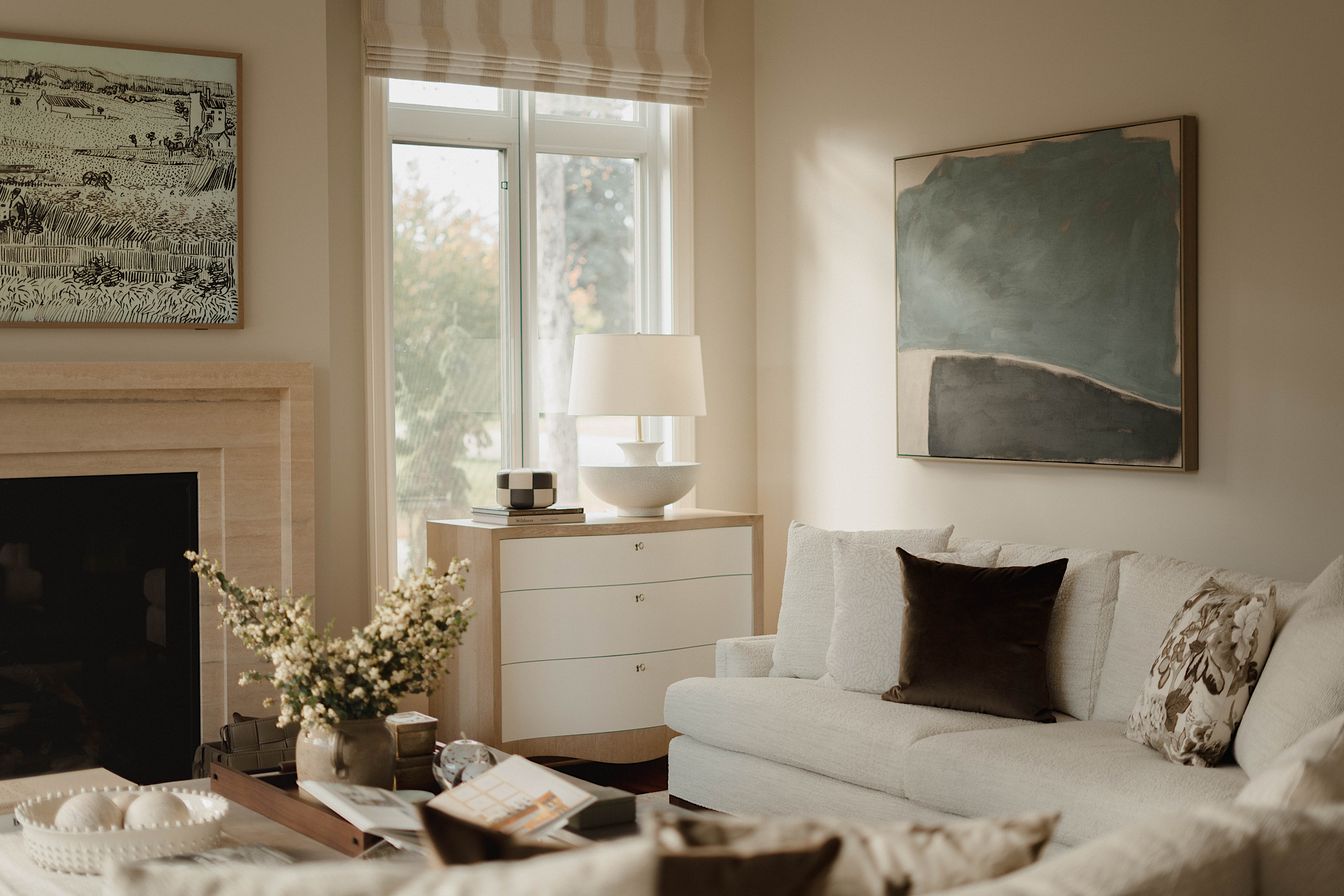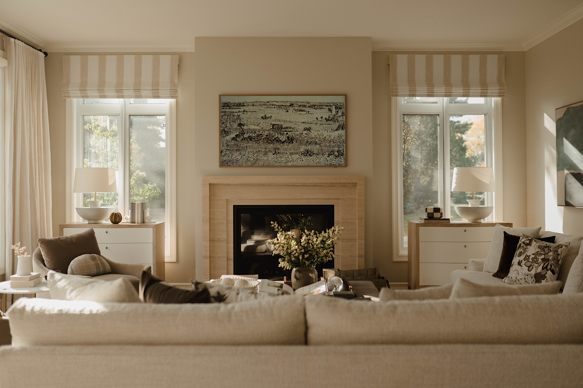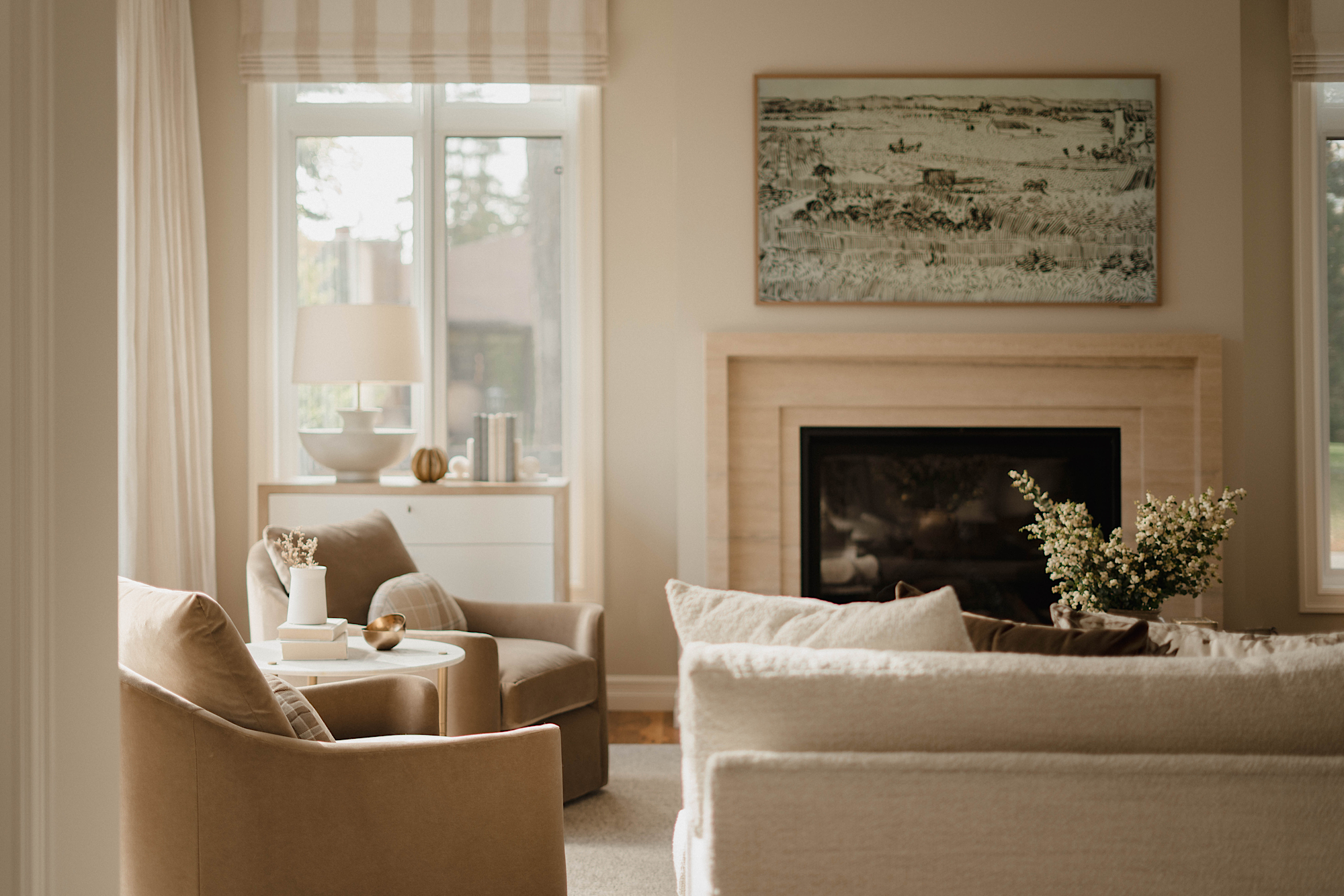 The main living area now features an all-new fireplace clad with travertine creating a captivating focal point. The appropriately built-out wall surrounding the fireplace adds dimension and style to the space.