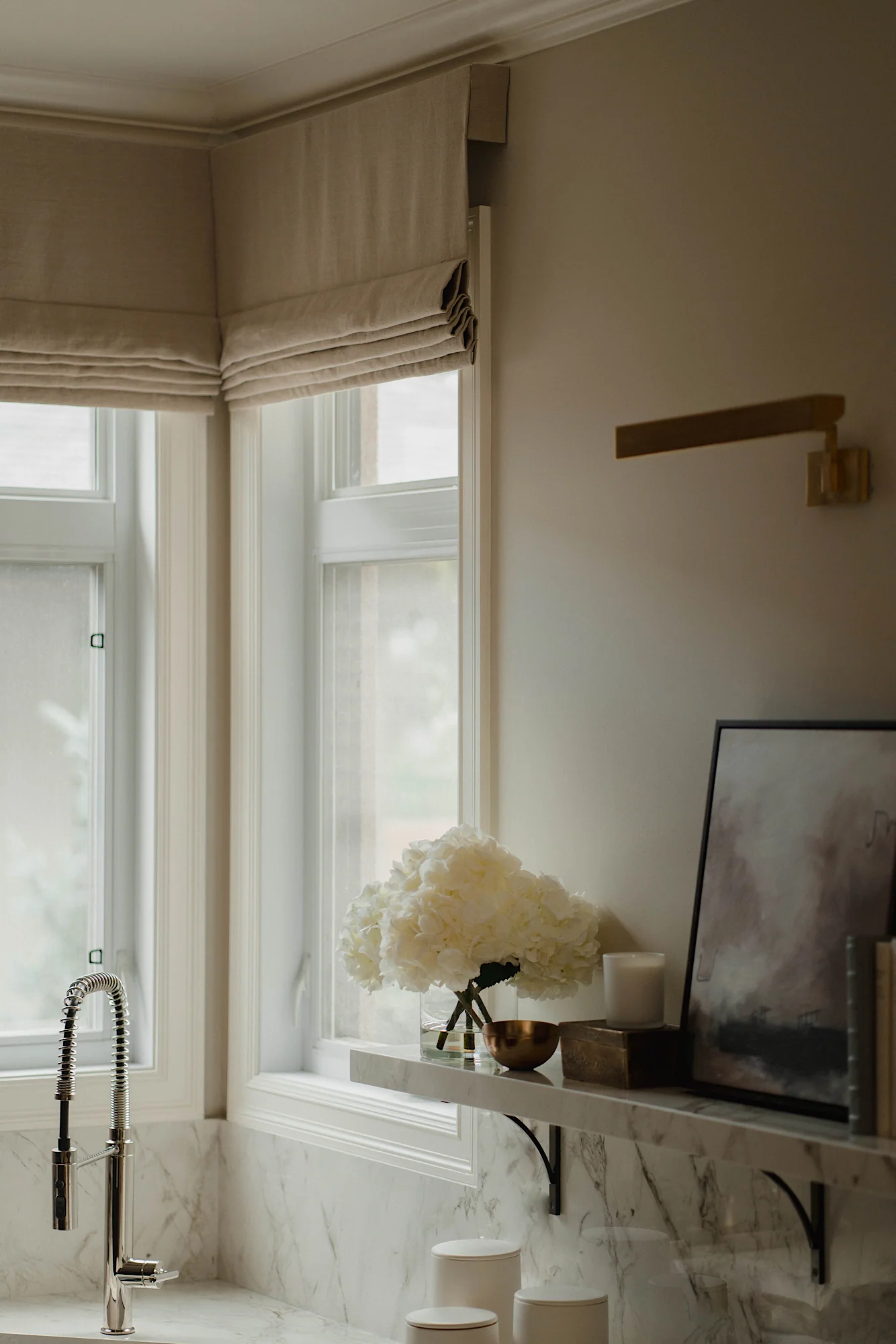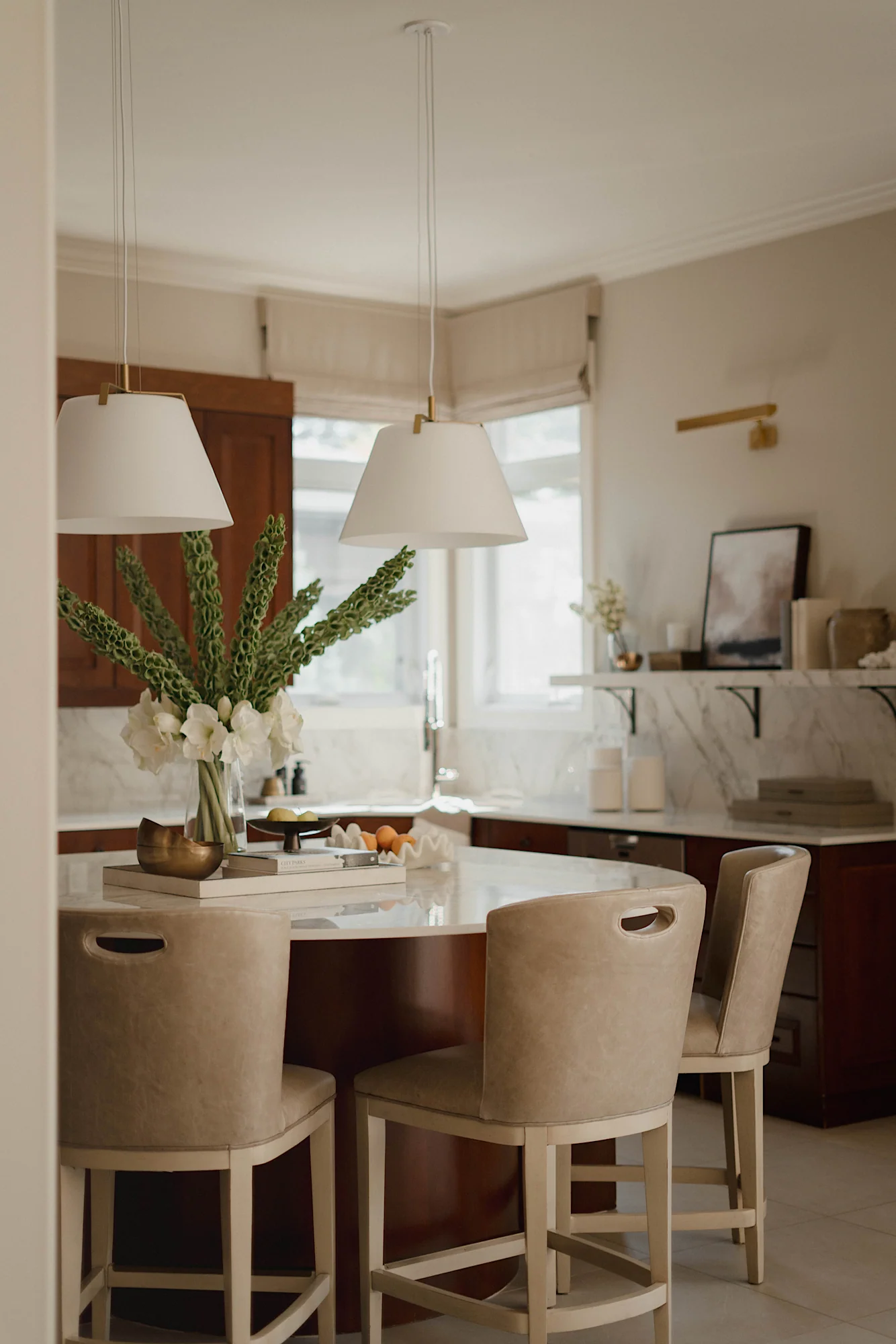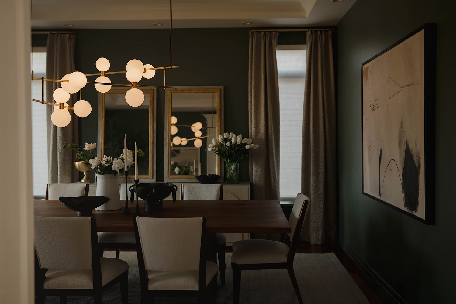 This stately residence in a heritage-rich neighborhood was transformed through a layered approach that combined warm neutrals, custom furnishings, and curated finishes to balance elegance with everyday livability. We embraced the homeowners’ distinct aesthetics by using bold yet timeless tones like Farrow & Ball’s Green Smoke in the dining room, and a soft mix of Shaded and Wimborne Whites throughout the main living areas.