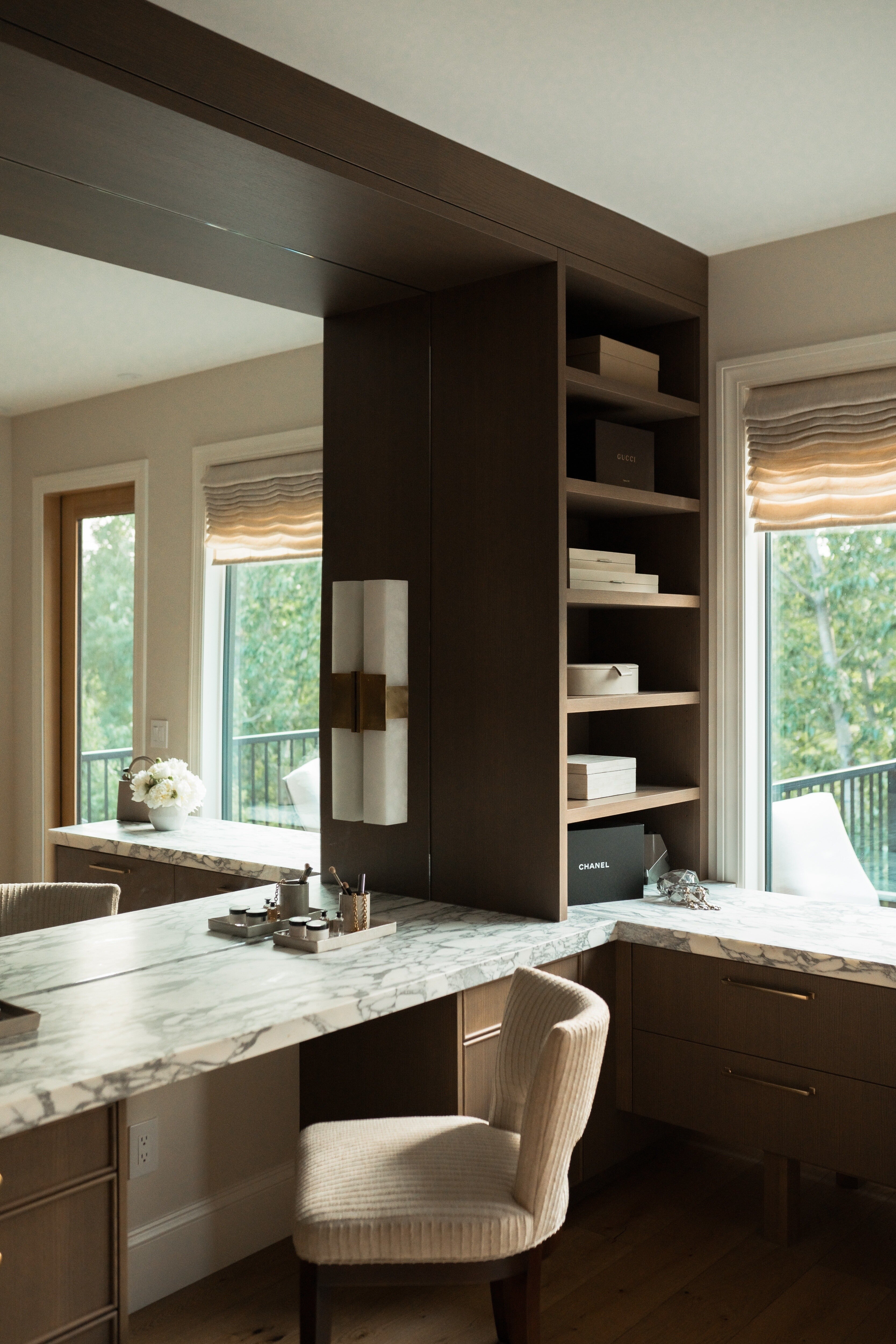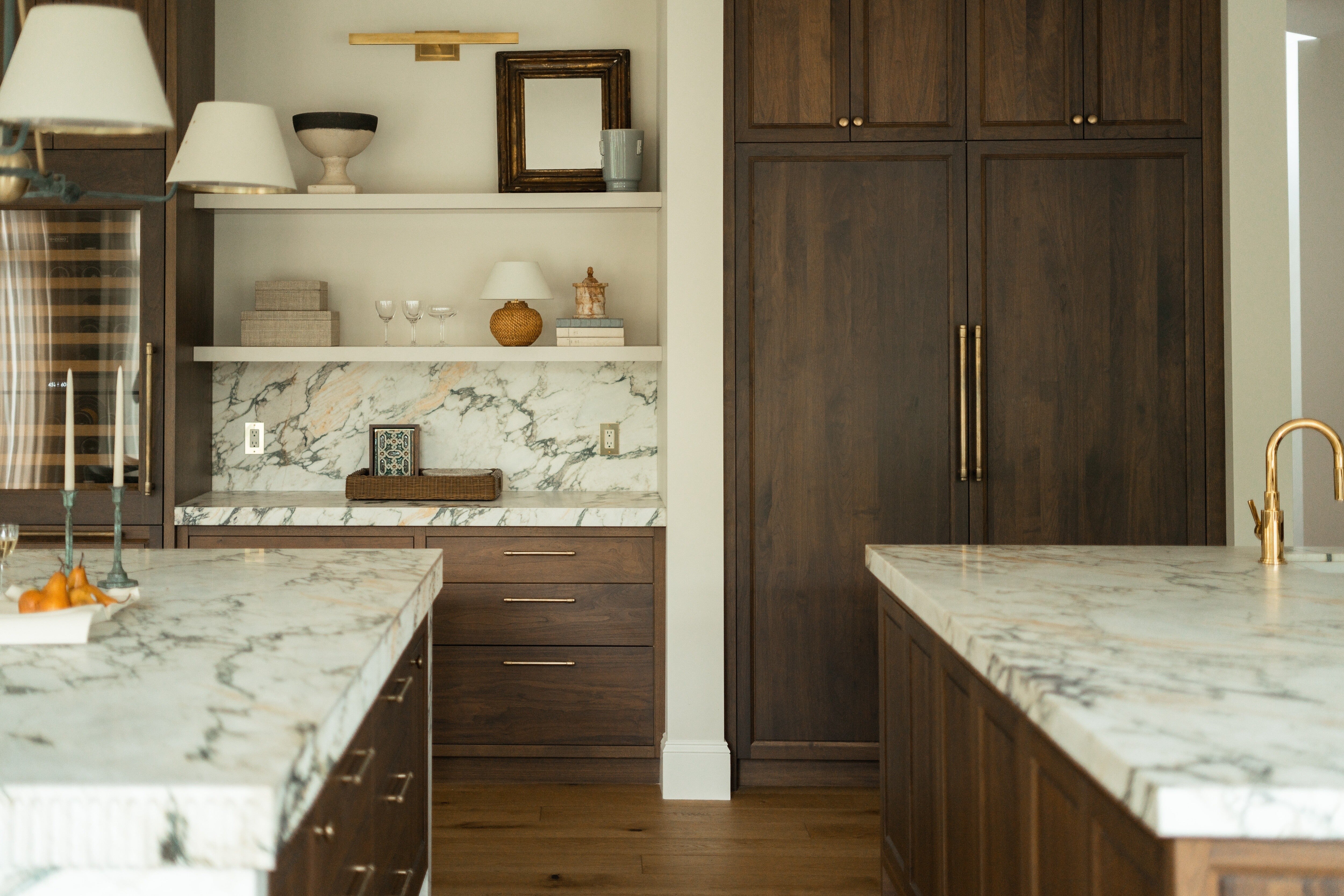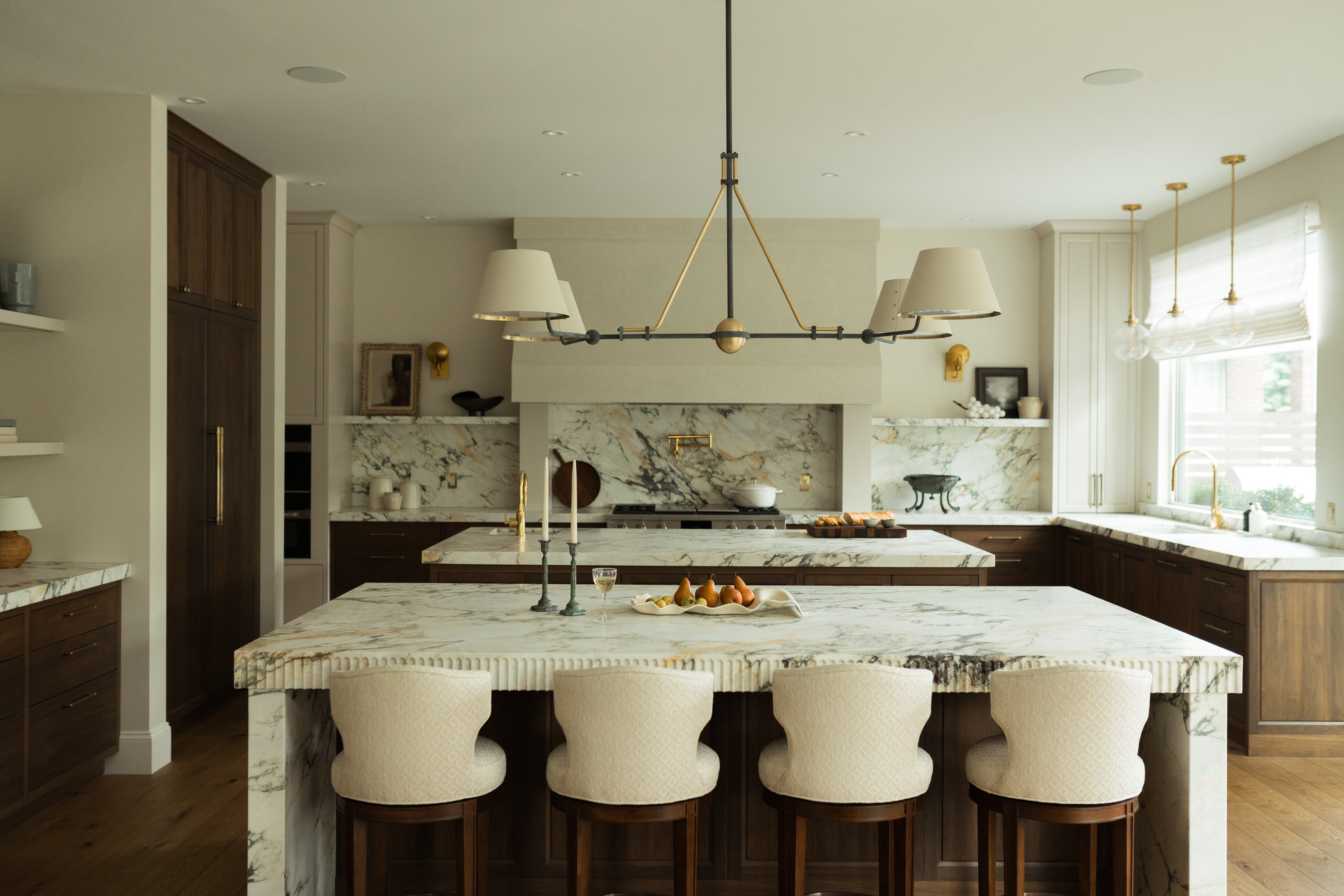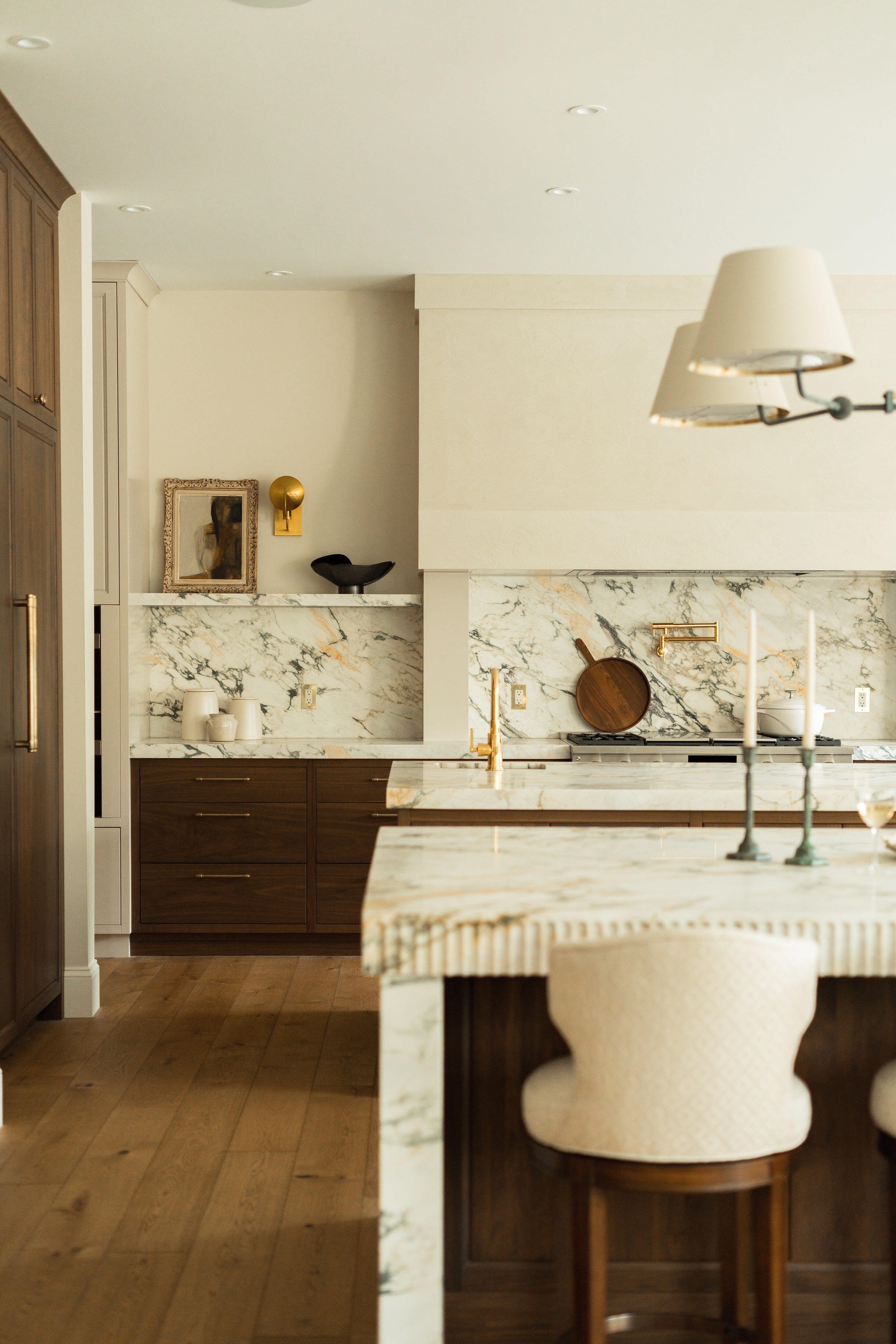 The kitchen serves as the centerpiece of the residence, designed to balance functionality and beauty. Calacatta Monet marble, with its striking veining, defines the countertops and backsplash. The fluted marble detailing on the island sides elevates the space with quiet drama, while warm wood cabinetry and brass accents create a timeless backdrop for family life and entertaining.
