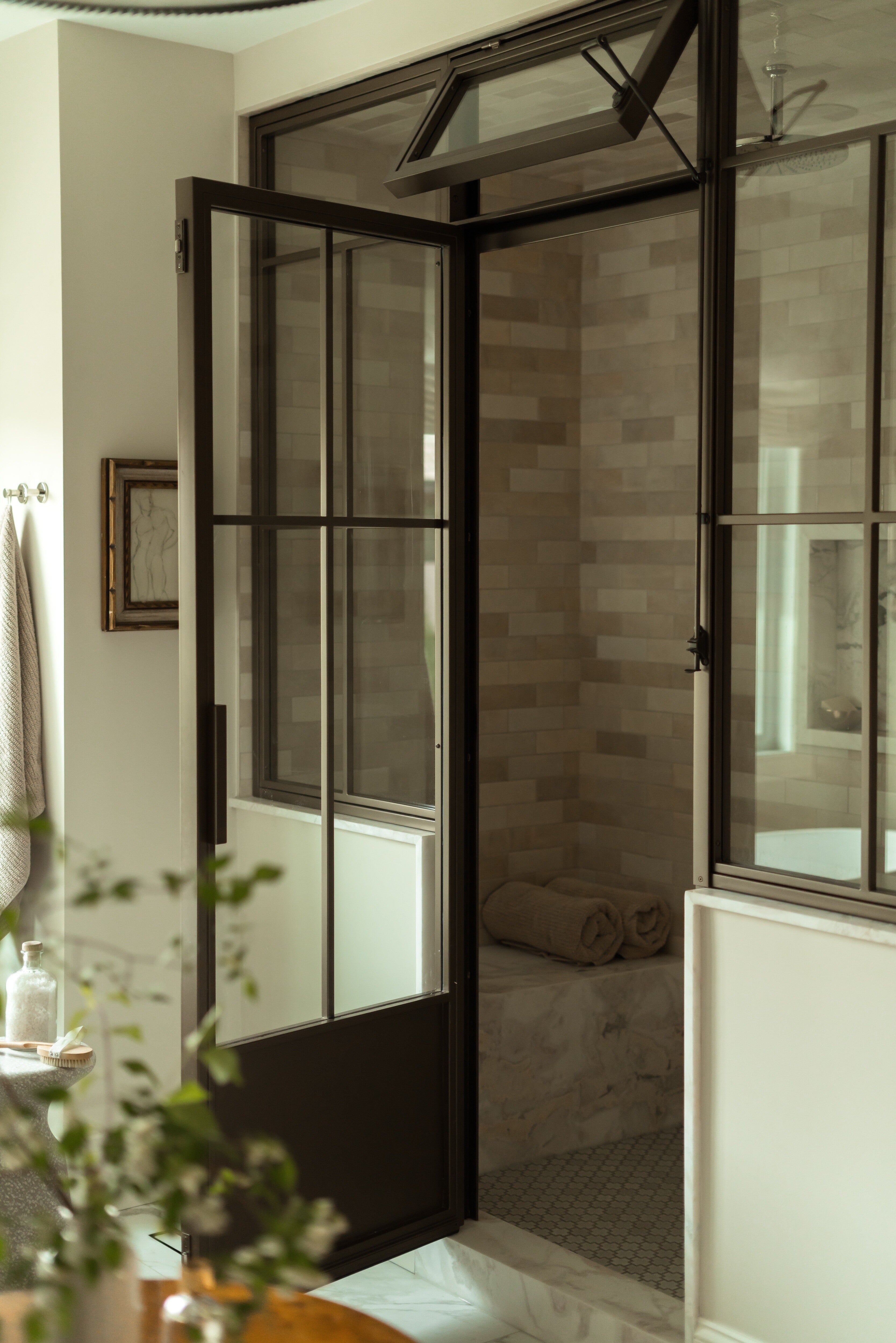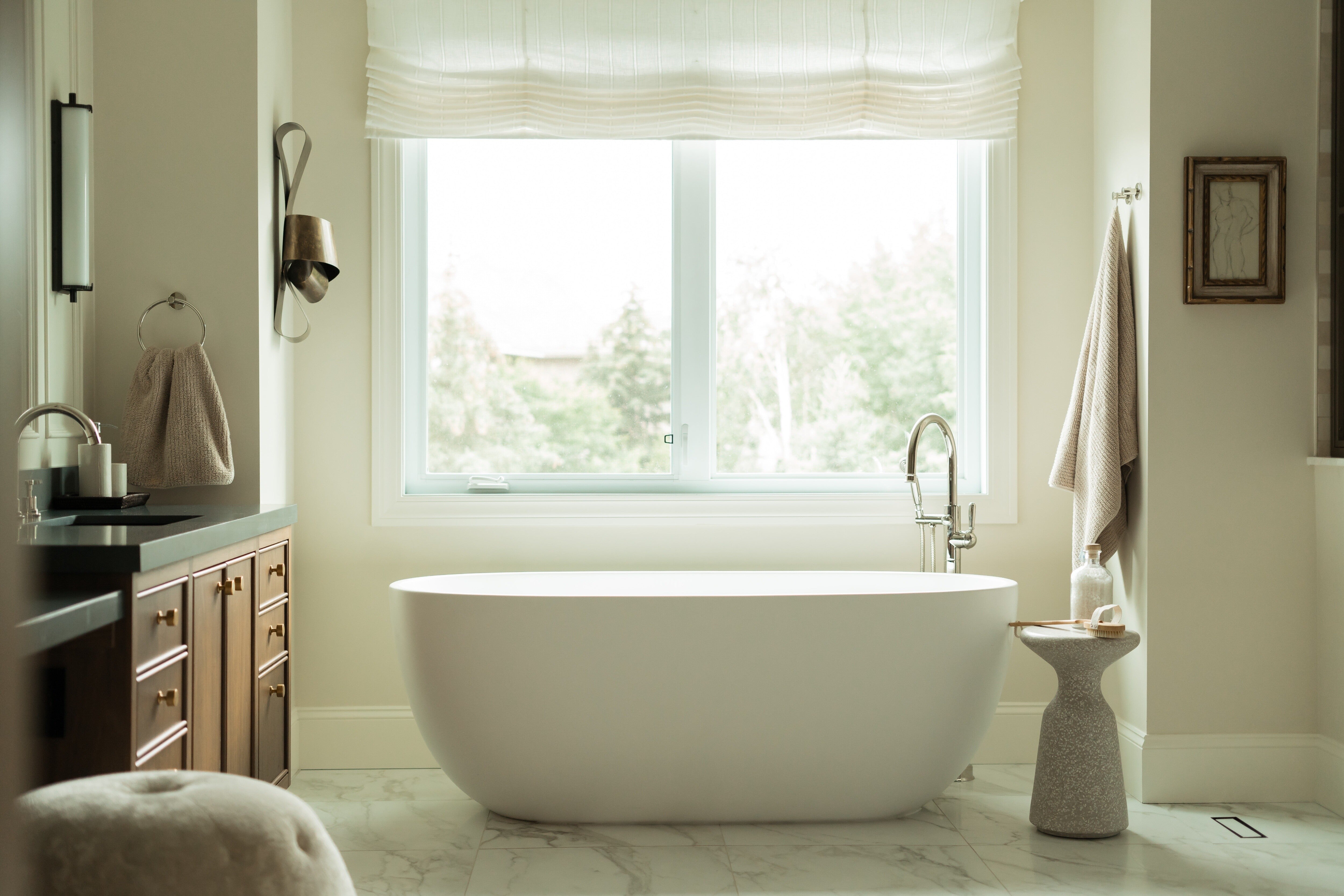 A standout room of the residence is the primary suite—a light-filled sanctuary overlooking the golf course that the property backs onto. Originally the area in need of the most transformation, it is now one of the home’s crown jewels. Beyond the suite’s double doors lies a generous walk-in closet and spa-like ensuite, leading into the sleeping quarters. Floor-to-ceiling windows frame the landscape, allowing the lush outdoors to flow seamlessly inside and infusing the room with a sense of calm retreat.