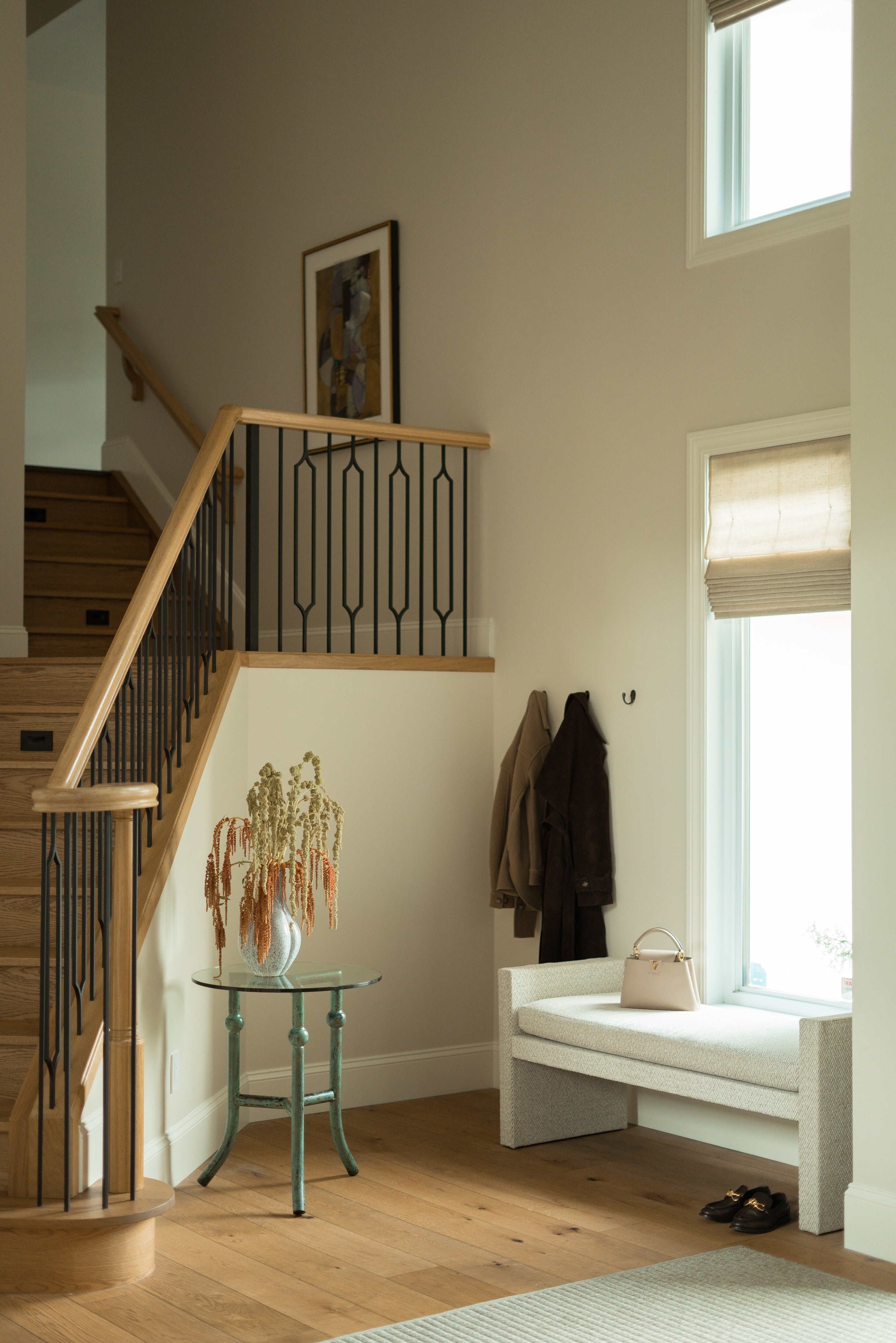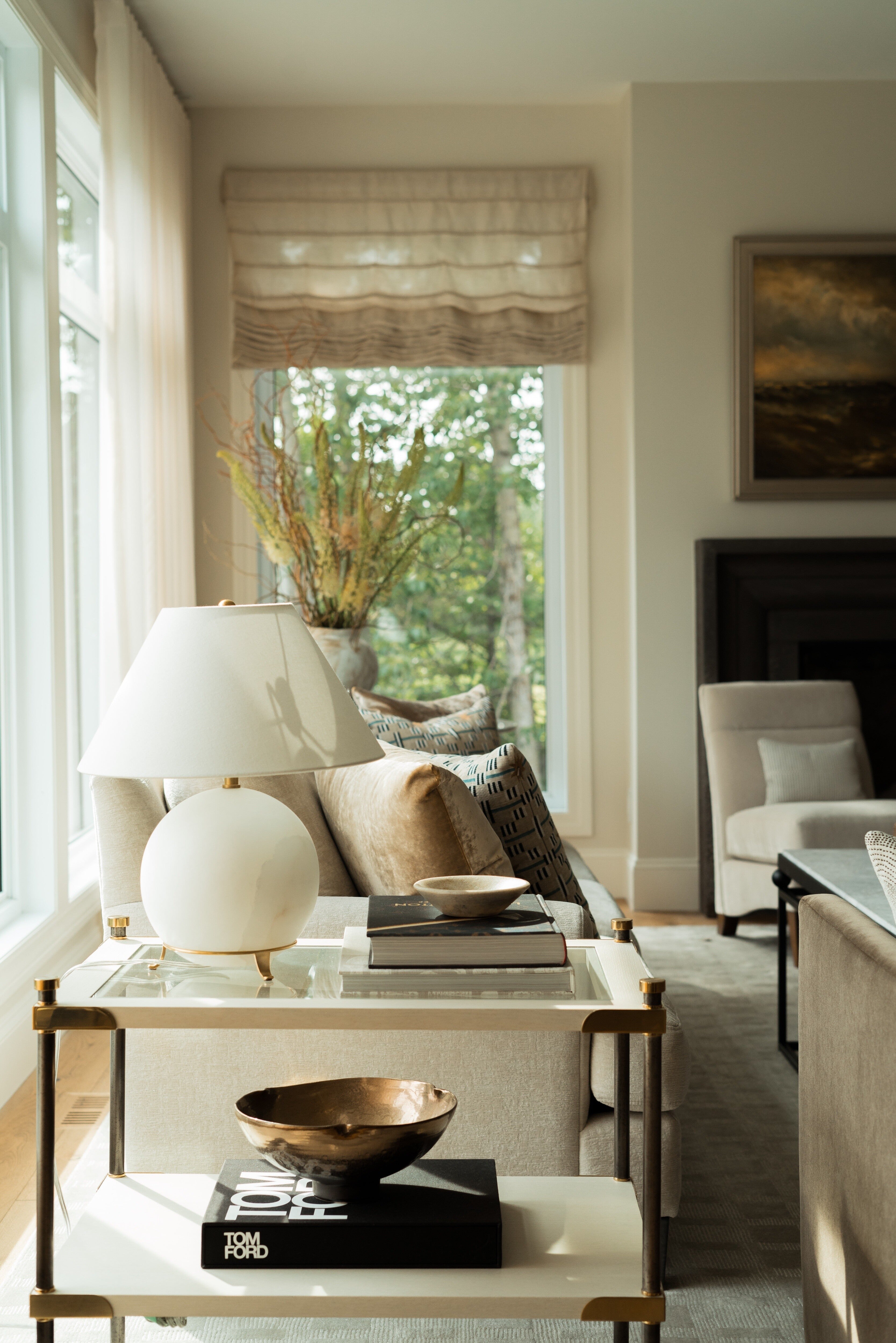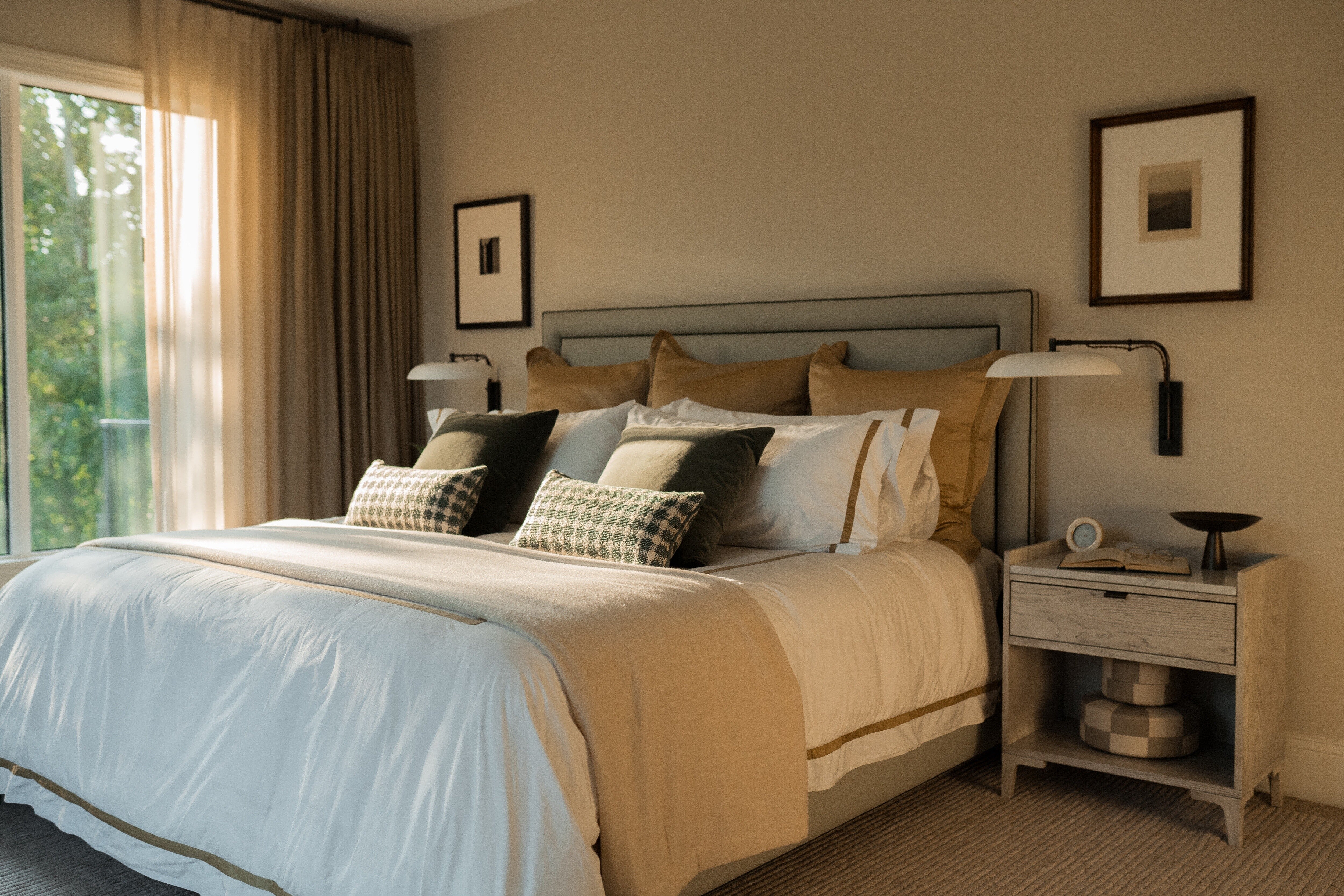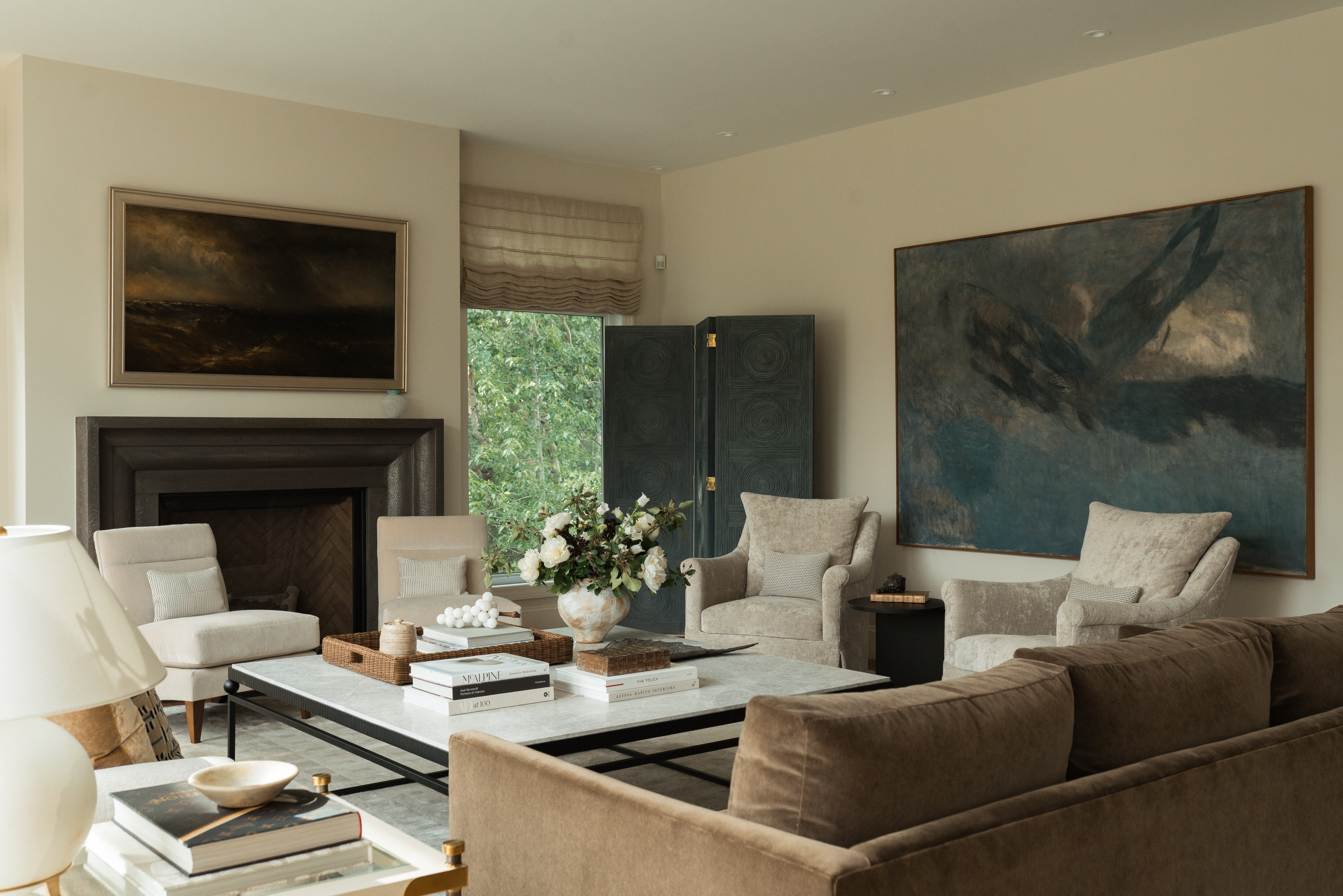 Throughout the main living areas, a palette of soft neutrals is layered with textural fabrics, curated artwork, and natural light. Thoughtful placement of inherited furnishings bridges the family’s history with their new surroundings. The interiors are designed to feel both grounded and refined, offering a warm sense of home while maintaining a gallery-like serenity.